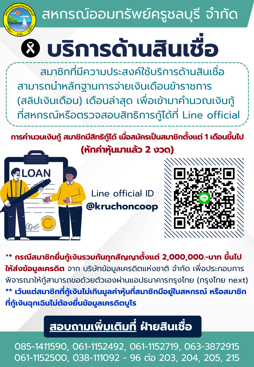 สมาชิกสามารถส่งสลิปเงินเดือน เพื่อคำนวนสิทธิการกู้เงินได้ผ่านทาง Line : @kruchoncoop