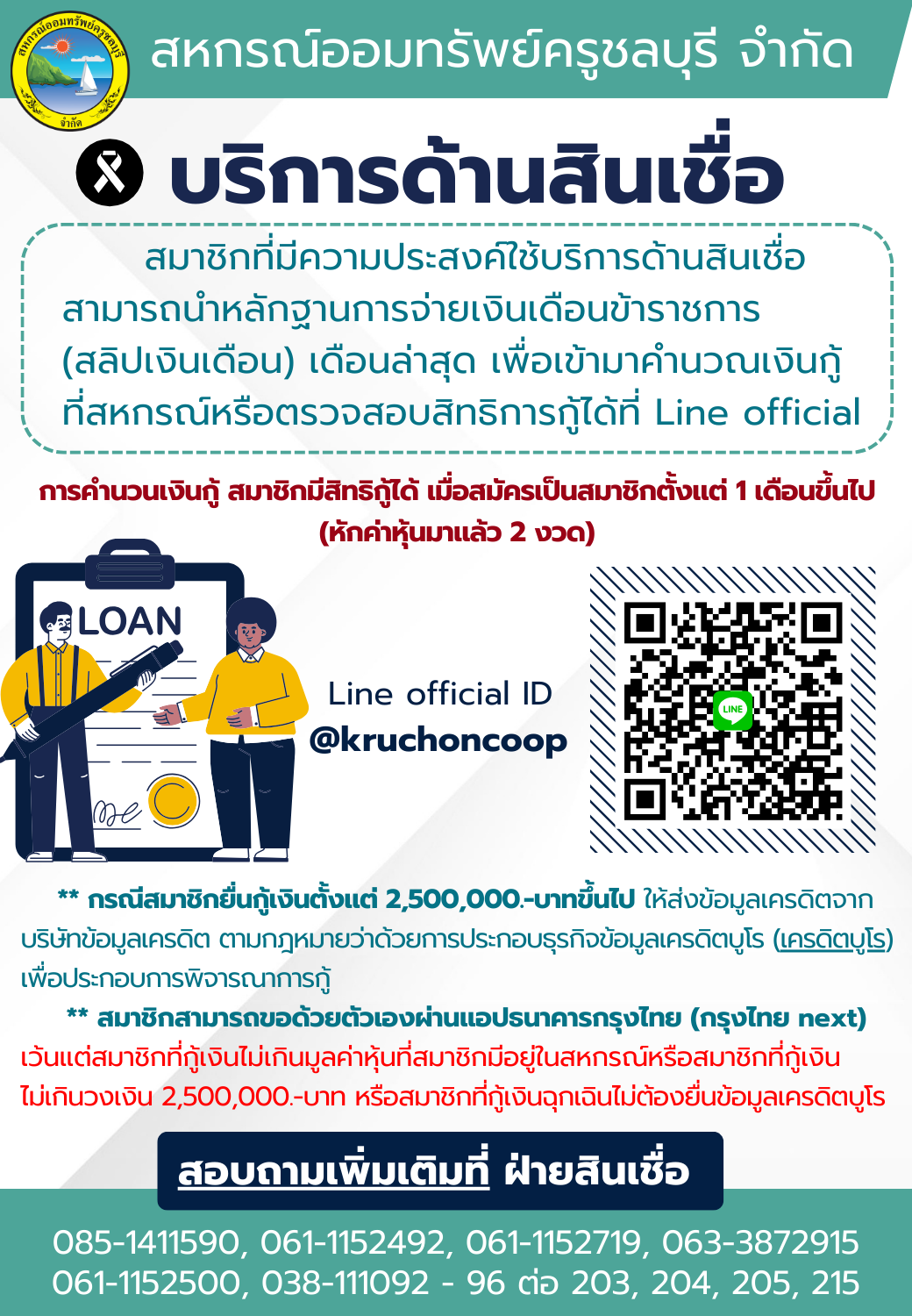 สมาชิกสามารถส่งสลิปเงินเดือน เพื่อคำนวนสิทธิการกู้เงินได้ผ่านทาง Line : @kruchoncoop