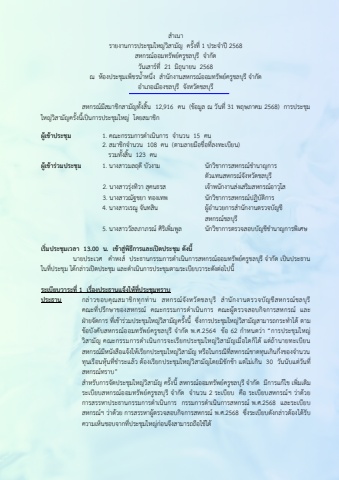 %u0e2a %u0e33%u0e40%u0e19%u0e33%u0e23%u0e33%u0e22%u0e07%u0e33%u0e19%u0e01%u0e33%u0e23%u0e1b%u0e23%u0e30%u0e0a%u0e38%u0e21%u0e43%u0e2b%u0e0d%u0e48%u0e27%u0e34%u0e2a%u0e33%u0e21%u0e31%u0e0d %u0e04%u0e23%u0e31%u0e49%u0e07%u0e17%u0e35%u0e48 1 %u0e1b%u0e23%u0e30%u0e08 %u0e33%u0e1b%u0e35 2568%u0e2a%u0e2b%u0e01%u0e23%u0e13%u0e4c%u0e2d%u0e2d%u0e21%u0e17%u0e23%u0e31%u0e1e%u0e22%u0e4c%u0e04%u0e23%u0e39%u0e0a%u0e25%u0e1a%u0e38%u0e23%u0e35 %u0e08 %u0e33%u0e01%u0e31%u0e14%u0e27%u0e31%u0e19%u0e40%u0e2a%u0e33%u0e23%u0e4c%u0e17%u0e35%u0e48 21 %u0e21%u0e34%u0e16%u0e38%u0e19%u0e33%u0e22%u0e19 2568%u0e13 %u0e2b%u0e49%u0e2d%u0e07%u0e1b%u0e23%u0e30%u0e0a%u0e38%u0e21%u0e40%u0e1e%u0e47%u0e0a%u0e23%u0e19%u0e49 %u0e33%u0e2b%u0e19%u0e36%u0e48%u0e07 %u0e2a %u0e33%u0e19%u0e31%u0e01%u0e07%u0e33%u0e19%u0e2a%u0e2b%u0e01%u0e23%u0e13%u0e4c%u0e2d%u0e2d%u0e21%u0e17%u0e23%u0e31%u0e1e%u0e22%u0e4c%u0e04%u0e23%u0e39%u0e0a%u0e25%u0e1a%u0e38%u0e23%u0e35 %u0e08 %u0e33%u0e01%u0e31%u0e14%u0e2d %u0e33%u0e40%u0e20%u0e2d%u0e40%u0e21%u0e37%u0e2d%u0e07%u0e0a%u0e25%u0e1a%u0e38%u0e23%u0e35 %u0e08%u0e31%u0e07%u0e2b%u0e27%u0e31%u0e14%u0e0a%u0e25%u0e1a%u0e38%u0e23%u0e35%u0e2a%u0e2b%u0e01%u0e23%u0e13%u0e4c%u0e21%u0e35%u0e2a%u0e21%u0e33%u0e0a%u0e34%u0e01%u0e2a%u0e33%u0e21%u0e31%u0e0d%u0e17%u0e31%u0e49%u0e07%u0e2a%u0e34%u0e49%u0e19 12,916 %u0e04%u0e19 (%u0e02%u0e49%u0e2d%u0e21%u0e39%u0e25 %u0e13 %u0e27%u0e31%u0e19%u0e17%u0e35%u0e48 31 %u0e1e%u0e24%u0e29%u0e20%u0e33%u0e04%u0e21 2568) %u0e01%u0e33%u0e23%u0e1b%u0e23%u0e30%u0e0a%u0e38%u0e21%u0e43%u0e2b%u0e0d%u0e48%u0e27%u0e34%u0e2a%u0e33%u0e21%u0e31%u0e0d%u0e04%u0e23%u0e31%u0e49%u0e07%u0e19%u0e35%u0e49%u0e40%u0e1b%u0e47%u0e19%u0e01%u0e33%u0e23%u0e1b%u0e23%u0e30%u0e0a%u0e38%u0e21%u0e43%u0e2b%u0e0d%u0e48 %u0e42%u0e14%u0e22%u0e2a%u0e21%u0e33%u0e0a%u0e34%u0e01%u0e1c%u0e39%u0e49%u0e40%u0e02%u0e49%u0e32%u0e1b%u0e23%u0e30%u0e0a%u0e38%u0e21 1. %u0e04%u0e13%u0e30%u0e01%u0e23%u0e23%u0e21%u0e01%u0e33%u0e23%u0e14 %u0e33%u0e40%u0e19%u0e34%u0e19%u0e01%u0e33%u0e23 %u0e08 %u0e33%u0e19%u0e27%u0e19 15 %u0e04%u0e192. %u0e2a%u0e21%u0e33%u0e0a%u0e34%u0e01%u0e08 %u0e33%u0e19%u0e27%u0e19 108 %u0e04%u0e19 (%u0e15%u0e33%u0e21%u0e25%u0e33%u0e22%u0e21%u0e37%u0e2d%u0e0a%u0e37%u0e48%u0e2d%u0e17%u0e35%u0e48%u0e25%u0e07%u0e17%u0e30%u0e40%u0e1a%u0e35%u0e22%u0e19) %u0e23%u0e27%u0e21%u0e17%u0e31%u0e49%u0e07%u0e2a%u0e34%u0e49%u0e19 123 %u0e04%u0e19%u0e1c%u0e39%u0e49%u0e40%u0e02%u0e49%u0e32%u0e23%u0e48%u0e27%u0e21%u0e1b%u0e23%u0e30%u0e0a%u0e38%u0e21 1. %u0e19%u0e33%u0e07%u0e2a%u0e33%u0e27%u0e21%u0e25%u0e24%u0e14%u0e35 %u0e1a%u0e31%u0e27%u0e07%u0e33%u0e21 %u0e19%u0e31%u0e01%u0e27%u0e34%u0e0a%u0e33%u0e01%u0e33%u0e23%u0e2a%u0e2b%u0e01%u0e23%u0e13%u0e4c%u0e0a %u0e33%u0e19%u0e33%u0e0d%u0e01%u0e33%u0e23 %u0e15%u0e31%u0e27%u0e41%u0e17%u0e19%u0e2a%u0e2b%u0e01%u0e23%u0e13%u0e4c%u0e08%u0e31%u0e07%u0e2b%u0e27%u0e31%u0e14%u0e0a%u0e25%u0e1a%u0e38%u0e23%u0e35 2. %u0e19%u0e33%u0e07%u0e2a%u0e33%u0e27%u0e23%u0e38%u0e48%u0e07%u0e17%u0e34%u0e27%u0e33 %u0e2a%u0e38%u0e04%u0e19%u0e18%u0e23%u0e2a %u0e40%u0e08%u0e49%u0e33%u0e1e%u0e19%u0e31%u0e01%u0e07%u0e33%u0e19%u0e2a%u0e48%u0e07%u0e40%u0e2a%u0e23%u0e34%u0e21%u0e2a%u0e2b%u0e01%u0e23%u0e13%u0e4c%u0e2d%u0e33%u0e27%u0e38%u0e42%u0e2a3. %u0e19%u0e33%u0e07%u0e2a%u0e33%u0e27%u0e13%u0e31%u0e10%u0e0a%u0e22%u0e33 %u0e17%u0e2d%u0e07%u0e40%u0e17%u0e1e %u0e19%u0e31%u0e01%u0e27%u0e34%u0e0a%u0e33%u0e01%u0e33%u0e23%u0e2a%u0e2b%u0e01%u0e23%u0e13%u0e4c%u0e1b%u0e0f%u0e34%u0e1a%u0e31%u0e15%u0e34%u0e01%u0e33%u0e234. %u0e19%u0e33%u0e07%u0e2a%u0e33%u0e27%u0e40%u0e23%u0e13%u0e39 %u0e08%u0e31%u0e19%u0e17%u0e2a%u0e34%u0e19 %u0e1c%u0e39%u0e49%u0e2d %u0e33%u0e19%u0e27%u0e22%u0e01%u0e33%u0e23%u0e2a %u0e33%u0e19%u0e31%u0e01%u0e07%u0e33%u0e19%u0e15%u0e23%u0e27%u0e08%u0e1a%u0e31%u0e0d%u0e0a%u0e35%u0e2a%u0e2b%u0e01%u0e23%u0e13%u0e4c%u0e0a%u0e25%u0e1a%u0e38%u0e23%u0e355. %u0e19%u0e33%u0e07%u0e2a%u0e33%u0e27%u0e27%u0e31%u0e25%u0e25%u0e20%u0e33%u0e20%u0e23%u0e13%u0e4c %u0e28%u0e34%u0e23%u0e34%u0e40%u0e1e%u0e34%u0e48%u0e21%u0e1e%u0e39%u0e25 %u0e19%u0e31%u0e01%u0e27%u0e34%u0e0a%u0e33%u0e01%u0e33%u0e23%u0e15%u0e23%u0e27%u0e08%u0e2a%u0e2d%u0e1a%u0e1a%u0e31%u0e0d%u0e0a%u0e35%u0e0a %u0e33%u0e19%u0e33%u0e0d%u0e01%u0e33%u0e23%u0e1e%u0e34%u0e40%u0e28%u0e29%u0e40%u0e23%u0e34%u0e48%u0e21%u0e1b%u0e23%u0e30%u0e0a%u0e38%u0e21%u0e40%u0e27%u0e25%u0e32 13.00 %u0e19. %u0e40%u0e02%u0e49%u0e32%u0e2a%u0e39%u0e48%u0e1e%u0e34%u0e18%u0e35%u0e01%u0e32%u0e23%u0e41%u0e25%u0e30%u0e40%u0e1b%u0e34%u0e14%u0e1b%u0e23%u0e30%u0e0a%u0e38%u0e21 %u0e14%u0e31%u0e07%u0e19%u0e35%u0e49%u0e19%u0e33%u0e22%u0e1b%u0e23%u0e30%u0e40%u0e27%u0e28 %u0e04 %u0e33%u0e2b%u0e07%u0e2a%u0e4c %u0e1b%u0e23%u0e30%u0e18%u0e33%u0e19%u0e01%u0e23%u0e23%u0e21%u0e01%u0e33%u0e23%u0e14 %u0e33%u0e40%u0e19%u0e34%u0e19%u0e01%u0e33%u0e23%u0e2a%u0e2b%u0e01%u0e23%u0e13%u0e4c%u0e2d%u0e2d%u0e21%u0e17%u0e23%u0e31%u0e1e%u0e22%u0e4c%u0e04%u0e23%u0e39%u0e0a%u0e25%u0e1a%u0e38%u0e23%u0e35 %u0e08 %u0e33%u0e01%u0e31%u0e14 %u0e40%u0e1b%u0e47%u0e19%u0e1b%u0e23%u0e30%u0e18%u0e33%u0e19%u0e43%u0e19%u0e17%u0e35%u0e48%u0e1b%u0e23%u0e30%u0e0a%u0e38%u0e21 %u0e44%u0e14%u0e49%u0e01%u0e25%u0e48%u0e33%u0e27%u0e40%u0e1b%u0e34%u0e14%u0e1b%u0e23%u0e30%u0e0a%u0e38%u0e21 %u0e41%u0e25%u0e30%u0e14 %u0e33%u0e40%u0e19%u0e34%u0e19%u0e01%u0e33%u0e23%u0e1b%u0e23%u0e30%u0e0a%u0e38%u0e21%u0e15%u0e33%u0e21%u0e23%u0e30%u0e40%u0e1a%u0e35%u0e22%u0e1a%u0e27%u0e33%u0e23%u0e30%u0e14%u0e31%u0e07%u0e15%u0e48%u0e2d%u0e44%u0e1b%u0e19%u0e35%u0e49%u0e23%u0e30%u0e40%u0e1a%u0e35%u0e22%u0e1a%u0e27%u0e32%u0e23%u0e30%u0e17%u0e35%u0e48 1 %u0e40%u0e23%u0e37%u0e48%u0e2d%u0e07%u0e1b%u0e23%u0e30%u0e18%u0e32%u0e19%u0e41%u0e08%u0e49%u0e07%u0e43%u0e2b%u0e49%u0e17%u0e35%u0e48%u0e1b%u0e23%u0e30%u0e0a%u0e38%u0e21%u0e17%u0e23%u0e32%u0e1a%u0e1b%u0e23%u0e30%u0e18%u0e32%u0e19 %u0e01%u0e25%u0e48%u0e33%u0e27%u0e02%u0e2d%u0e1a%u0e04%u0e38%u0e13%u0e2a%u0e21%u0e33%u0e0a%u0e34%u0e01%u0e17%u0e38%u0e01%u0e17%u0e48%u0e33%u0e19 %u0e2a%u0e2b%u0e01%u0e23%u0e13%u0e4c%u0e08%u0e31%u0e07%u0e2b%u0e27%u0e31%u0e14%u0e0a%u0e25%u0e1a%u0e38%u0e23%u0e35 %u0e2a %u0e33%u0e19%u0e31%u0e01%u0e07%u0e33%u0e19%u