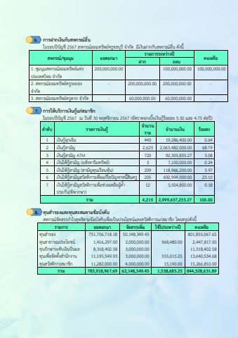 %u0e01%u0e32%u0e23%u0e1d%u0e32%u0e01%u0e40%u0e07%u0e34%u0e19%u0e01%u0e31%u0e1a%u0e2a%u0e2b%u0e01%u0e23%u0e13%u0e4c%u0e2d%u0e37%u0e48%u0e19%u0e43%u0e19%u0e23%u0e2d%u0e1a%u0e1b%u0e35%u0e1a%u0e31%u0e0d%u0e0a%u0e352567 %u0e2a%u0e2b%u0e01%u0e23%u0e13%u0e4c%u0e2d%u0e2d%u0e21%u0e17%u0e23%u0e31%u0e1e%u0e22%u0e4c%u0e04%u0e23%u0e39%u0e0a%u0e25%u0e1a%u0e38%u0e23%u0e35 %u0e08 %u0e33%u0e01%u0e31%u0e14 %u0e21%u0e35%u0e40%u0e07%u0e34%u0e19%u0e1d%u0e33%u0e01%u0e01%u0e31%u0e1a%u0e2a%u0e2b%u0e01%u0e23%u0e13%u0e4c%u0e2d%u0e37%u0e48%u0e19 %u0e14%u0e31%u0e07%u0e19%u0e35%u0e49%u0e2a%u0e2b%u0e01%u0e23%u0e13%u0e4c/%u0e0a%u0e38%u0e21%u0e19%u0e38%u0e21 %u0e22%u0e2d%u0e14%u0e22%u0e01%u0e21%u0e32%u0e23%u0e32%u0e22%u0e01%u0e32%u0e23%u0e23%u0e30%u0e2b%u0e27%u0e48%u0e32%u0e07%u0e1b%u0e35 %u0e04%u0e07%u0e40%u0e2b%u0e25%u0e37%u0e2d%u0e1d%u0e32%u0e01 %u0e16%u0e2d%u0e191. %u0e0a%u0e38%u0e21%u0e19%u0e38%u0e21%u0e2a%u0e2b%u0e01%u0e23%u0e13%u0e4c%u0e2d%u0e2d%u0e21%u0e17%u0e23%u0e31%u0e1e%u0e22%u0e4c%u0e41%u0e2b%u0e48%u0e07%u0e1b%u0e23%u0e30%u0e40%u0e17%u0e28%u0e44%u0e17%u0e22 %u0e08 %u0e33%u0e01%u0e31%u0e14200,000,000.00 - 100,000,000.00 100,000,000.002. %u0e2a%u0e2b%u0e01%u0e23%u0e13%u0e4c%u0e2d%u0e2d%u0e21%u0e17%u0e23%u0e31%u0e1e%u0e22%u0e4c%u0e04%u0e23%u0e39%u0e23%u0e30%u0e22%u0e2d%u0e07 %u0e08 %u0e33%u0e01%u0e31%u0e14- 200,000,000.00 200,000,000.00 -3. %u0e2a%u0e2b%u0e01%u0e23%u0e13%u0e4c%u0e2d%u0e2d%u0e21%u0e17%u0e23%u0e31%u0e1e%u0e22%u0e4c%u0e04%u0e23%u0e39%u0e15%u0e33%u0e01 %u0e08 %u0e33%u0e01%u0e31%u0e14 - 60,000,000.00 60,000,000.00 -%u0e01%u0e32%u0e23%u0e43%u0e2b%u0e49%u0e1a%u0e23%u0e34%u0e01%u0e32%u0e23%u0e40%u0e07%u0e34%u0e19%u0e01%u0e39%u0e49%u0e41%u0e01%u0e48%u0e2a%u0e21%u0e32%u0e0a%u0e34%u0e01%u0e43%u0e19%u0e23%u0e2d%u0e1a%u0e1b%u0e35%u0e1a%u0e31%u0e0d%u0e0a%u0e352567 %u0e13 %u0e27%u0e31%u0e19%u0e17%u0e35%u0e48 30 %u0e1e%u0e24%u0e28%u0e08%u0e34%u0e01%u0e33%u0e22%u0e19 2567 (%u0e2d%u0e31%u0e15%u0e23%u0e33%u0e14%u0e2d%u0e01%u0e40%u0e1a%u0e35%u0e49%u0e22%u0e40%u0e07%u0e34%u0e19%u0e01%u0e39%u0e49%u0e23%u0e49%u0e2d%u0e22%u0e25%u0e30 5.50 %u0e41%u0e25%u0e30 4.75 %u0e15%u0e48%u0e2d%u0e1b%u0e35) %u0e25 %u0e32%u0e14%u0e31%u0e1a %u0e23%u0e32%u0e22%u0e01%u0e32%u0e23%u0e40%u0e07%u0e34%u0e19%u0e01%u0e39%u0e49 %u0e08 %u0e32%u0e19%u0e27%u0e19%u0e23%u0e32%u0e22%u0e08 %u0e32%u0e19%u0e27%u0e19%u0e40%u0e07%u0e34%u0e19 %u0e23%u0e49%u0e2d%u0e22%u0e25%u0e301 %u0e40%u0e07%u0e34%u0e19%u0e01%u0e39%u0e49%u0e09%u0e38%u0e01%u0e40%u0e09%u0e34%u0e19 443 19,286,400.00 0.642 %u0e40%u0e07%u0e34%u0e19%u0e01%u0e39%u0e49%u0e2a%u0e33%u0e21%u0e31%u0e0d 2,623 2,063,482,000.00 68.793 %u0e40%u0e07%u0e34%u0e19%u0e01%u0e39%u0e49%u0e2a%u0e33%u0e21%u0e31%u0e0d ATM 720 92,303,833.27 3.084 %u0e40%u0e07%u0e34%u0e19%u0e43%u0e2b%u0e49%u0e01%u0e39%u0e49%u0e2a%u0e33%u0e21%u0e31%u0e0d (%u0e2d%u0e2a%u0e31%u0e07%u0e2b%u0e33%u0e23%u0e34%u0e21%u0e17%u0e23%u0e31%u0e1e%u0e22%u0e4c) 3 7,100,000.00 0.245 %u0e40%u0e07%u0e34%u0e19%u0e43%u0e2b%u0e49%u0e01%u0e39%u0e49%u0e2a%u0e33%u0e21%u0e31%u0e0d (%u0e2a%u0e33%u0e21%u0e31%u0e0d%u0e17%u0e38%u0e19%u0e40%u0e23%u0e37%u0e2d%u0e19%u0e2b%u0e38%u0e49%u0e19) 209 118,966,200.00 3.976 %u0e40%u0e07%u0e34%u0e19%u0e43%u0e2b%u0e49%u0e01%u0e39%u0e49%u0e2a%u0e33%u0e21%u0e31%u0e0d%u0e2a%u0e27%u0e31%u0e2a%u0e14%u0e34%u0e01%u0e33%u0e23%u0e40%u0e1e%u0e37%u0e48%u0e2d%u0e41%u0e01%u0e49%u0e44%u0e02%u0e1b%u0e31%u0e0d%u0e2b%u0e33%u0e2b%u0e19%u0e35%u0e49%u0e2a%u0e34%u0e19%u0e04%u0e23%u0e39 205 692,994,000.00 23.107 %u0e40%u0e07%u0e34%u0e19%u0e43%u0e2b%u0e49%u0e01%u0e39%u0e49%u0e2a%u0e33%u0e21%u0e31%u0e0d%u0e2a%u0e27%u0e31%u0e2a%u0e14%u0e34%u0e01%u0e33%u0e23%u0e40%u0e1e%u0e37%u0e48%u0e2d%u0e0a%u0e48%u0e27%u0e22%u0e40%u0e2b%u0e25%u0e37%u0e2d%u0e1c%u0e39%u0e49%u0e04%u0e49 %u0e33%u0e1b%u0e23%u0e30%u0e01%u0e31%u0e19(%u0e1e%u0e34%u0e1e%u0e33%u0e01%u0e29%u0e33)12 5,504,800.00 0.18%u0e23%u0e27%u0e21 4,215 2,999,637,233.27 100.00%u0e17%u0e38%u0e19%u0e2a %u0e32%u0e23%u0e2d%u0e07%u0e41%u0e25%u0e30%u0e17%u0e38%u0e19%u0e2a%u0e30%u0e2a%u0e21%u0e15%u0e32%u0e21%u0e02%u0e49%u0e2d%u0e1a%u0e31%u0e07%u0e04%u0e31%u0e1a%u0e2a%u0e2b%u0e01%u0e23%u0e13%u0e4c%u0e08%u0e31%u0e14%u0e2a%u0e23%u0e23%u0e01 %u0e33%u0e44%u0e23%u0e2a%u0e38%u0e17%u0e18%u0e34%u0e15%u0e33%u0e21%u0e02%u0e49%u0e2d%u0e1a%u0e31%u0e07%u0e04%u0e31%u0e1a%u0e40%u0e1e%u0e37%u0e48%u0e2d%u0e40%u0e1b%u0e47%u0e19%u0e1b%u0e23%u0e30%u0e42%u0e22%u0e0a%u0e19%u0e4c%u0e41%u0e25%u0e30%u0e2a%u0e27%u0e31%u0e2a%u0e14%u0e34%u0e01%u0e33%u0e23%u0e41%u0e01%u0e48%u0e2a%u0e21%u0e33%u0e0a%u0e34%u0e01 %u0e42%u0e14%u0e22%u0e2a%u0e23%u0e38%u0e1b%u0e14%u0e31%u0e07%u0e19%u0e35%u0e49%u0e23%u0e32%u0e22%u0e01%u0e32%u0e23 %u0e22%u0e2d%u0e14%u0e22%u0e01%u0e21%u0e32 %u0e08%u0e31%u0e14%u0e2a%u0e23%u0e23%u0e40%u0e1e%u0e34%u0e48%u0e21 %u0e43%u0e0a%u0e49%u0e44%u0e1b%u0e23%u0e30%u0e2b%u0e27%u0e48%u0e32%u0e07%u0e1b%u0e35 %u0e04%u0e07%u0e40%u0e2b%u0e25%u0e37%u0e2d%u0e17%u0e38%u0e19%u0e2a %u0e33%u0e23%u0e2d%u0e07%u0e17%u0e38%u0e19%u0e2a%u0e33%u0e18%u0e33%u0e23%u0e13%u0e1b%u0e23%u0e30%u0e42%u0e22%u0e0a%u0e19%u0e4c%u0e17%u0e38%u0e19%u0e23%u0e31%u0e01%u0e29%u0e33%u0e23%u0e30%u0e14%u0e31%u0e1a%u0e40%u0e07%u0e34%u0e19%u0e1b%u0e31%u0e19%u0e1c%u0e25%u0e17%u0e38%u0e19%u0e40%u0e1e%u0e37%u0e48%u0e2d%u0e08%u0e31%u0e14%u0e15%u0e31%u0e49%u0e07%u0e2a %u0e33%u0e19%u0e31%u0e01%u0e07%u0e33%u0e19%u0e17%u0e38%u0e19%u0e2a%u0e27%u0e31%u0e2a%u0e14%u0e34%u0e01%u0e33%u0e23%u0e2a%u0e21%u0e33%u0e0a%u0e34%u0e01751,706,718.181,416,297.008,318,402.5811,195,549.9311,282,000.0050,148,349.452,000,000.00 3,000,000.00 3,000,000.00 4,000,000.00-968,480.00-555,015.2515,190.00801,855,067.632,447,817.0011,318,402.5813,640,534.6815,266,810.00%u0e23%u0e27%u0e21 783,918,967.69 62,148,349.45 1,538,685.25 844,528,631.897.8.6.