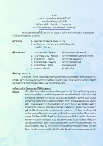 %u0e2a %u0e33%u0e40%u0e19%u0e33%u0e23%u0e33%u0e22%u0e07%u0e33%u0e19%u0e01%u0e33%u0e23%u0e1b%u0e23%u0e30%u0e0a%u0e38%u0e21%u0e43%u0e2b%u0e0d%u0e48%u0e2a%u0e33%u0e21%u0e31%u0e0d%u0e1b%u0e23%u0e30%u0e08 %u0e33%u0e1b%u0e35 2567%u0e2a%u0e2b%u0e01%u0e23%u0e13%u0e4c%u0e2d%u0e2d%u0e21%u0e17%u0e23%u0e31%u0e1e%u0e22%u0e4c%u0e04%u0e23%u0e39%u0e0a%u0e25%u0e1a%u0e38%u0e23%u0e35 %u0e08 %u0e33%u0e01%u0e31%u0e14(%u0e1b%u0e35%u0e17%u0e35%u0e48 64) %u0e04%u0e23%u0e31%u0e49%u0e07%u0e17%u0e35%u0e48 1 %u0e27%u0e31%u0e19%u0e40%u0e2a%u0e33%u0e23%u0e4c%u0e17%u0e35%u0e48 21 %u0e18%u0e31%u0e19%u0e27%u0e33%u0e04%u0e21 2567%u0e13 %u0e42%u0e23%u0e07%u0e40%u0e23%u0e35%u0e22%u0e19%u0e0a%u0e25%u0e01%u0e31%u0e19%u0e22%u0e33%u0e19%u0e38%u0e01%u0e39%u0e25 %u0e2d %u0e33%u0e40%u0e20%u0e2d%u0e40%u0e21%u0e37%u0e2d%u0e07%u0e0a%u0e25%u0e1a%u0e38%u0e23%u0e35 %u0e08%u0e31%u0e07%u0e2b%u0e27%u0e31%u0e14%u0e0a%u0e25%u0e1a%u0e38%u0e23%u0e35%u0e2a%u0e2b%u0e01%u0e23%u0e13%u0e4c%u0e21%u0e35%u0e2a%u0e21%u0e33%u0e0a%u0e34%u0e01%u0e2a%u0e33%u0e21%u0e31%u0e0d%u0e17%u0e31%u0e49%u0e07%u0e2a%u0e34%u0e49%u0e19 13,192 %u0e04%u0e19 (%u0e02%u0e49%u0e2d%u0e21%u0e39%u0e25 %u0e13 %u0e27%u0e31%u0e19%u0e17%u0e35%u0e48 30 %u0e1e%u0e24%u0e28%u0e08%u0e34%u0e01%u0e33%u0e22%u0e19 2567) %u0e01%u0e33%u0e23%u0e1b%u0e23%u0e30%u0e0a%u0e38%u0e21%u0e43%u0e2b%u0e0d%u0e48%u0e04%u0e23%u0e31%u0e49%u0e07%u0e19%u0e35%u0e49%u0e40%u0e1b%u0e47%u0e19%u0e01%u0e33%u0e23%u0e1b%u0e23%u0e30%u0e0a%u0e38%u0e21%u0e43%u0e2b%u0e0d%u0e48 %u0e42%u0e14%u0e22%u0e2a%u0e21%u0e33%u0e0a%u0e34%u0e01%u0e1c%u0e39%u0e49%u0e40%u0e02%u0e49%u0e32%u0e1b%u0e23%u0e30%u0e0a%u0e38%u0e21 1. %u0e04%u0e13%u0e30%u0e01%u0e23%u0e23%u0e21%u0e01%u0e33%u0e23%u0e14 %u0e33%u0e40%u0e19%u0e34%u0e19%u0e01%u0e33%u0e23 %u0e08 %u0e33%u0e19%u0e27%u0e19 15 %u0e04%u0e192. %u0e2a%u0e21%u0e33%u0e0a%u0e34%u0e01%u0e08 %u0e33%u0e19%u0e27%u0e19 1,301 %u0e04%u0e19 (%u0e15%u0e33%u0e21%u0e25%u0e33%u0e22%u0e21%u0e37%u0e2d%u0e0a%u0e37%u0e48%u0e2d%u0e17%u0e35%u0e48%u0e25%u0e07%u0e17%u0e30%u0e40%u0e1a%u0e35%u0e22%u0e19)%u0e23%u0e27%u0e21%u0e17%u0e31%u0e49%u0e07%u0e2a%u0e34%u0e49%u0e19 1,316 %u0e04%u0e19%u0e1c%u0e39%u0e49%u0e40%u0e02%u0e49%u0e32%u0e23%u0e48%u0e27%u0e21%u0e1b%u0e23%u0e30%u0e0a%u0e38%u0e21 1. %u0e19%u0e33%u0e07%u0e2a%u0e33%u0e27%u0e1e%u0e34%u0e21%u0e25%u0e21%u0e33%u0e28 %u0e2a%u0e34%u0e21%u0e2b%u0e0a%u0e33%u0e15%u0e34 %u0e1c%u0e39%u0e49%u0e2d %u0e33%u0e19%u0e27%u0e22%u0e01%u0e33%u0e23%u0e01%u0e25%u0e38%u0e48%u0e21%u0e2a%u0e48%u0e07%u0e40%u0e2a%u0e23%u0e34%u0e21%u0e2a%u0e2b%u0e01%u0e23%u0e13%u0e4c 12. %u0e19%u0e33%u0e07%u0e2a%u0e33%u0e27%u0e27%u0e31%u0e25%u0e25%u0e20%u0e33%u0e20%u0e23%u0e13%u0e4c %u0e28%u0e34%u0e23%u0e34%u0e40%u0e1e%u0e34%u0e48%u0e21%u0e1e%u0e39%u0e25 %u0e19%u0e31%u0e01%u0e27%u0e34%u0e0a%u0e33%u0e01%u0e33%u0e23%u0e15%u0e23%u0e27%u0e08%u0e2a%u0e2d%u0e1a%u0e1a%u0e31%u0e0d%u0e0a%u0e35%u0e0a %u0e33%u0e19%u0e33%u0e0d%u0e01%u0e33%u0e23%u0e1e%u0e34%u0e40%u0e28%u0e293. %u0e19%u0e33%u0e07%u0e2a%u0e33%u0e27%u0e13%u0e31%u0e10%u0e0a%u0e22%u0e33 %u0e17%u0e2d%u0e07%u0e40%u0e17%u0e1e %u0e19%u0e31%u0e01%u0e27%u0e34%u0e0a%u0e33%u0e01%u0e33%u0e23%u0e2a%u0e2b%u0e01%u0e23%u0e13%u0e4c%u0e1b%u0e0f%u0e34%u0e1a%u0e31%u0e15%u0e34%u0e01%u0e33%u0e234. %u0e19%u0e33%u0e07%u0e2a%u0e33%u0e27%u0e17%u0e34%u0e1e%u0e27%u0e23%u0e23%u0e13 %u0e27%u0e31%u0e12%u0e19%u0e42%u0e22%u0e18%u0e34%u0e19 %u0e19%u0e31%u0e01%u0e27%u0e34%u0e0a%u0e33%u0e01%u0e33%u0e23%u0e15%u0e23%u0e27%u0e08%u0e2a%u0e2d%u0e1a%u0e1a%u0e31%u0e0d%u0e0a%u0e355. %u0e19%u0e33%u0e07%u0e2a%u0e33%u0e27%u0e2a%u0e38%u0e01%u0e31%u0e0d%u0e0d%u0e33 %u0e1e%u0e31%u0e0a%u0e23%u0e35%u0e01%u0e23 %u0e15%u0e31%u0e27%u0e41%u0e17%u0e19%u0e1c%u0e39%u0e49%u0e2a%u0e2d%u0e1a%u0e1a%u0e31%u0e0d%u0e0a%u0e356. %u0e19%u0e33%u0e22%u0e18%u0e19%u0e17%u0e23 %u0e40%u0e1e%u0e35%u0e22%u0e27%u0e07%u0e29%u0e4c %u0e1c%u0e39%u0e49%u0e0a%u0e48%u0e27%u0e22%u0e1c%u0e39%u0e49%u0e2a%u0e2d%u0e1a%u0e1a%u0e31%u0e0d%u0e0a%u0e35%u0e40%u0e23%u0e34%u0e48%u0e21%u0e1b%u0e23%u0e30%u0e0a%u0e38%u0e21 09.00 %u0e19. %u0e19%u0e33%u0e22%u0e1b%u0e23%u0e30%u0e40%u0e27%u0e28 %u0e04 %u0e33%u0e2b%u0e07%u0e2a%u0e4c %u0e1b%u0e23%u0e30%u0e18%u0e33%u0e19%u0e01%u0e23%u0e23%u0e21%u0e01%u0e33%u0e23%u0e14 %u0e33%u0e40%u0e19%u0e34%u0e19%u0e01%u0e33%u0e23%u0e2a%u0e2b%u0e01%u0e23%u0e13%u0e4c%u0e2d%u0e2d%u0e21%u0e17%u0e23%u0e31%u0e1e%u0e22%u0e4c%u0e04%u0e23%u0e39%u0e0a%u0e25%u0e1a%u0e38%u0e23%u0e35 %u0e08 %u0e33%u0e01%u0e31%u0e14 %u0e19 %u0e33%u0e04%u0e13%u0e30%u0e1c%u0e39%u0e49%u0e1a%u0e23%u0e34%u0e2b%u0e33%u0e23%u0e2a%u0e2b%u0e01%u0e23%u0e13%u0e4c %u0e2a%u0e21%u0e33%u0e0a%u0e34%u0e01%u0e17%u0e35%u0e48%u0e40%u0e02%u0e49%u0e33%u0e23%u0e48%u0e27%u0e21%u0e1b%u0e23%u0e30%u0e0a%u0e38%u0e21%u0e1a%u0e39%u0e0a%u0e33%u0e1e%u0e23%u0e30%u0e23%u0e31%u0e15%u0e19%u0e15%u0e23%u0e31%u0e22%u0e41%u0e25%u0e30%u0e23%u0e48%u0e27%u0e21%u0e01%u0e31%u0e19%u0e23%u0e49%u0e2d%u0e07%u0e40%u0e1e%u0e25%u0e07%u0e2a%u0e23%u0e23%u0e40%u0e2a%u0e23%u0e34%u0e0d%u0e1e%u0e23%u0e30%u0e1a%u0e33%u0e23%u0e21%u0e35%u0e1e%u0e23%u0e30%u0e1a%u0e33%u0e17%u0e2a%u0e21%u0e40%u0e14%u0e47%u0e08%u0e1e%u0e23%u0e30%u0e1b%u0e23%u0e40%u0e21%u0e19%u0e17%u0e23%u0e23%u0e33%u0e21%u0e33%u0e18%u0e34%u0e1a%u0e14%u0e35%u0e28%u0e23%u0e35%u0e2a%u0e34%u0e19%u0e17%u0e23%u0e21%u0e2b%u0e33%u0e27%u0e0a%u0e34%u0e23%u0e33%u0e25%u0e07%u0e01%u0e23%u0e13 %u0e1e%u0e23%u0e30%u0e27%u0e0a%u0e34%u0e23%u0e40%u0e01%u0e25%u0e49%u0e33%u0e40%u0e08%u0e49%u0e33%u0e2d%u0e22%u0e39%u0e48%u0e2b%u0e31%u0e27%u0e23%u0e30%u0e40%u0e1a%u0e35%u0e22%u0e1a%u0e27%u0e32%u0e23%u0e30%u0e17%u0e35%u0e48 1 %u0e40%u0e23%u0e37%u0e48%u0e2d%u0e07%u0e1b%u0e23%u0e30%u0e18%u0e32%u0e19%u0e41%u0e08%u0e49%u0e07%u0e43%u0e2b%u0e49%u0e17%u0e35%u0e48%u0e1b%u0e23%u0e30%u0e0a%u0e38%u0e21%u0e17%u0e23%u0e32%u0e1a%u0e1b%u0e23%u0e30%u0e18%u0e32%u0e19 %u0e41%u0e08%u0e49%u0e07%u0e27%u0e48%u0e33%u0e40%u0e23%u0e35%u0e22%u0e19%u0e17%u0e48%u0e33%u0e19%u0e2a%u0e21%u0e33%u0e0a%u0e34%u0e01%u0e2a%u0e2b%u0e01%u0e23%u0e13%u0e4c%u0e2d%u0e2d%u0e21%u0e17%u0e23%u0e31%u0e1e%u0e22%u0e4c%u0e04%u0e23%u0e39%u0e0a%u0e25%u0e1a%u0e38%u0e23%u0e35 %u0e08 %u0e33%u0e01%u0e31%u0e14 %u0e17%u0e35%u0e48%u0e40%u