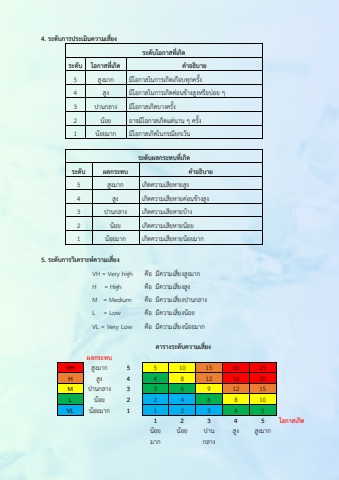 4. %u0e23%u0e30%u0e14%u0e31%u0e1a%u0e01%u0e32%u0e23%u0e1b%u0e23%u0e30%u0e40%u0e21%u0e34%u0e19%u0e04%u0e27%u0e32%u0e21%u0e40%u0e2a%u0e35%u0e48%u0e22%u0e07%u0e23%u0e30%u0e14%u0e31%u0e1a%u0e42%u0e2d%u0e01%u0e32%u0e2a%u0e17%u0e35%u0e48%u0e40%u0e01%u0e34%u0e14%u0e23%u0e30%u0e14%u0e31%u0e1a %u0e42%u0e2d%u0e01%u0e32%u0e2a%u0e17%u0e35%u0e48%u0e40%u0e01%u0e34%u0e14 %u0e04 %u0e32%u0e2d%u0e18%u0e34%u0e1a%u0e32%u0e225 %u0e2a%u0e39%u0e07%u0e21%u0e33%u0e01 %u0e21%u0e35%u0e42%u0e2d%u0e01%u0e33%u0e2a%u0e43%u0e19%u0e01%u0e33%u0e23%u0e40%u0e01%u0e34%u0e14%u0e40%u0e01%u0e37%u0e2d%u0e1a%u0e17%u0e38%u0e01%u0e04%u0e23%u0e31%u0e49%u0e074 %u0e2a%u0e39%u0e07 %u0e21%u0e35%u0e42%u0e2d%u0e01%u0e33%u0e2a%u0e43%u0e19%u0e01%u0e33%u0e23%u0e40%u0e01%u0e34%u0e14%u0e04%u0e48%u0e2d%u0e19%u0e02%u0e49%u0e33%u0e07%u0e2a%u0e39%u0e07%u0e2b%u0e23%u0e37%u0e2d%u0e1a%u0e48%u0e2d%u0e22 %u0e463 %u0e1b%u0e33%u0e19%u0e01%u0e25%u0e33%u0e07 %u0e21%u0e35%u0e42%u0e2d%u0e01%u0e33%u0e2a%u0e40%u0e01%u0e34%u0e14%u0e1a%u0e33%u0e07%u0e04%u0e23%u0e31%u0e49%u0e072 %u0e19%u0e49%u0e2d%u0e22 %u0e2d%u0e33%u0e08%u0e21%u0e35%u0e42%u0e2d%u0e01%u0e33%u0e2a%u0e40%u0e01%u0e34%u0e14%u0e41%u0e15%u0e48%u0e19%u0e33%u0e19 %u0e46 %u0e04%u0e23%u0e31%u0e49%u0e071 %u0e19%u0e49%u0e2d%u0e22%u0e21%u0e33%u0e01 %u0e21%u0e35%u0e42%u0e2d%u0e01%u0e33%u0e2a%u0e40%u0e01%u0e34%u0e14%u0e43%u0e19%u0e01%u0e23%u0e13%u0e35%u0e22%u0e01%u0e40%u0e27%u0e49%u0e19%u0e23%u0e30%u0e14%u0e31%u0e1a%u0e1c%u0e25%u0e01%u0e23%u0e30%u0e17%u0e1a%u0e17%u0e35%u0e48%u0e40%u0e01%u0e34%u0e14%u0e23%u0e30%u0e14%u0e31%u0e1a %u0e1c%u0e25%u0e01%u0e23%u0e30%u0e17%u0e1a %u0e04 %u0e32%u0e2d%u0e18%u0e34%u0e1a%u0e32%u0e225 %u0e2a%u0e39%u0e07%u0e21%u0e33%u0e01 %u0e40%u0e01%u0e34%u0e14%u0e04%u0e27%u0e33%u0e21%u0e40%u0e2a%u0e35%u0e22%u0e2b%u0e33%u0e22%u0e2a%u0e39%u0e074 %u0e2a%u0e39%u0e07 %u0e40%u0e01%u0e34%u0e14%u0e04%u0e27%u0e33%u0e21%u0e40%u0e2a%u0e35%u0e22%u0e2b%u0e33%u0e22%u0e04%u0e48%u0e2d%u0e19%u0e02%u0e49%u0e33%u0e07%u0e2a%u0e39%u0e073 %u0e1b%u0e33%u0e19%u0e01%u0e25%u0e33%u0e07 %u0e40%u0e01%u0e34%u0e14%u0e04%u0e27%u0e33%u0e21%u0e40%u0e2a%u0e35%u0e22%u0e2b%u0e33%u0e22%u0e1a%u0e49%u0e33%u0e072 %u0e19%u0e49%u0e2d%u0e22 %u0e40%u0e01%u0e34%u0e14%u0e04%u0e27%u0e33%u0e21%u0e40%u0e2a%u0e35%u0e22%u0e2b%u0e33%u0e22%u0e19%u0e49%u0e2d%u0e221 %u0e19%u0e49%u0e2d%u0e22%u0e21%u0e33%u0e01 %u0e40%u0e01%u0e34%u0e14%u0e04%u0e27%u0e33%u0e21%u0e40%u0e2a%u0e35%u0e22%u0e2b%u0e33%u0e22%u0e19%u0e49%u0e2d%u0e22%u0e21%u0e33%u0e015. %u0e23%u0e30%u0e14%u0e31%u0e1a%u0e01%u0e32%u0e23%u0e27%u0e34%u0e40%u0e04%u0e23%u0e32%u0e30%u0e2b%u0e4c%u0e04%u0e27%u0e32%u0e21%u0e40%u0e2a%u0e35%u0e48%u0e22%u0e07VH = Very high %u0e04%u0e37%u0e2d %u0e21%u0e35%u0e04%u0e27%u0e33%u0e21%u0e40%u0e2a%u0e35%u0e48%u0e22%u0e07%u0e2a%u0e39%u0e07%u0e21%u0e33%u0e01H = High %u0e04%u0e37%u0e2d %u0e21%u0e35%u0e04%u0e27%u0e33%u0e21%u0e40%u0e2a%u0e35%u0e48%u0e22%u0e07%u0e2a%u0e39%u0e07M = Medium %u0e04%u0e37%u0e2d %u0e21%u0e35%u0e04%u0e27%u0e33%u0e21%u0e40%u0e2a%u0e35%u0e48%u0e22%u0e07%u0e1b%u0e33%u0e19%u0e01%u0e25%u0e33%u0e07L = Low %u0e04%u0e37%u0e2d %u0e21%u0e35%u0e04%u0e27%u0e33%u0e21%u0e40%u0e2a%u0e35%u0e48%u0e22%u0e07%u0e19%u0e49%u0e2d%u0e22VL = Very Low %u0e04%u0e37%u0e2d %u0e21%u0e35%u0e04%u0e27%u0e33%u0e21%u0e40%u0e2a%u0e35%u0e48%u0e22%u0e07%u0e19%u0e49%u0e2d%u0e22%u0e21%u0e33%u0e01%u0e15%u0e32%u0e23%u0e32%u0e07%u0e23%u0e30%u0e14%u0e31%u0e1a%u0e04%u0e27%u0e32%u0e21%u0e40%u0e2a%u0e35%u0e48%u0e22%u0e07%u0e1c%u0e25%u0e01%u0e23%u0e30%u0e17%u0e1aVH %u0e2a%u0e39%u0e07%u0e21%u0e33%u0e01 5 5 10 15 20 25H %u0e2a%u0e39%u0e07 4 4 8 12 16 20M %u0e1b%u0e33%u0e19%u0e01%u0e25%u0e33%u0e07 3 3 6 9 12 15L %u0e19%u0e49%u0e2d%u0e22 2 2 4 6 8 10VL %u0e19%u0e49%u0e2d%u0e22%u0e21%u0e33%u0e01 1 1 2 3 4 51 2 3 4 5 %u0e42%u0e2d%u0e01%u0e32%u0e2a%u0e40%u0e01%u0e34%u0e14%u0e19%u0e49%u0e2d%u0e22 %u0e19%u0e49%u0e2d%u0e22 %u0e1b%u0e33%u0e19 %u0e2a%u0e39%u0e07 %u0e2a%u0e39%u0e07%u0e21%u0e33%u0e01%u0e21%u0e33%u0e01 %u0e01%u0e25%u0e33%u0e07