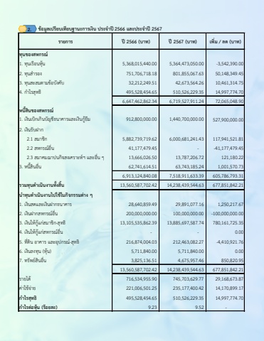 %u0e02%u0e49%u0e2d%u0e21%u0e39%u0e25%u0e40%u0e1b%u0e23%u0e35%u0e22%u0e1a%u0e40%u0e17%u0e35%u0e22%u0e1a%u0e10%u0e32%u0e19%u0e30%u0e01%u0e32%u0e23%u0e40%u0e07%u0e34%u0e19 %u0e1b%u0e23%u0e30%u0e08 %u0e32%u0e1b%u0e352566 %u0e41%u0e25%u0e30%u0e1b%u0e23%u0e30%u0e08 %u0e32%u0e1b%u0e352567%u0e23%u0e32%u0e22%u0e01%u0e32%u0e23 %u0e1b%u0e352566 (%u0e1a%u0e32%u0e17) %u0e1b%u0e352567 (%u0e1a%u0e32%u0e17) %u0e40%u0e1e%u0e34%u0e48%u0e21 / %u0e25%u0e14 (%u0e1a%u0e32%u0e17)%u0e17%u0e38%u0e19%u0e02%u0e2d%u0e07%u0e2a%u0e2b%u0e01%u0e23%u0e13%u0e4c1. %u0e17%u0e38%u0e19%u0e40%u0e23%u0e37%u0e2d%u0e19%u0e2b%u0e38%u0e49%u0e19 5,368,015,440.00 5,364,473,050.00 -3,542,390.002. %u0e17%u0e38%u0e19%u0e2a %u0e33%u0e23%u0e2d%u0e07 751,706,718.18 801,855,067.63 50,148,349.453. %u0e17%u0e38%u0e19%u0e2a%u0e30%u0e2a%u0e21%u0e15%u0e33%u0e21%u0e02%u0e49%u0e2d%u0e1a%u0e31%u0e07%u0e04%u0e31%u0e1a 32,212,249.51 42,673,564.26 10,461,314.754. %u0e01 %u0e33%u0e44%u0e23%u0e2a%u0e38%u0e17%u0e18%u0e34 495,528,454.65 510,526,229.35 14,997,774.70 6,647,462,862.34 6,719,527,911.24 72,065,048.90%u0e2b%u0e19%u0e35%u0e49%u0e2a%u0e34%u0e19%u0e02%u0e2d%u0e07%u0e2a%u0e2b%u0e01%u0e23%u0e13%u0e4c1. %u0e40%u0e07%u0e34%u0e19%u0e40%u0e1a%u0e34%u0e01%u0e40%u0e01%u0e34%u0e19%u0e1a%u0e31%u0e0d%u0e0a%u0e35%u0e18%u0e19%u0e33%u0e04%u0e33%u0e23%u0e41%u0e25%u0e30%u0e40%u0e07%u0e34%u0e19%u0e01%u0e39%u0e49%u0e22%u0e37%u0e21 912,800,000.00 1,440,700,000.00 527,900,000.002. %u0e40%u0e07%u0e34%u0e19%u0e23%u0e31%u0e1a%u0e1d%u0e33%u0e01 2.1 %u0e2a%u0e21%u0e33%u0e0a%u0e34%u0e01 5,882,739,719.62 6,000,681,241.43 117,941,521.81 2.2 %u0e2a%u0e2b%u0e01%u0e23%u0e13%u0e4c%u0e2d%u0e37%u0e48%u0e19 41,177,479.45 - -41,177,479.45 2.3 %u0e2a%u0e21%u0e33%u0e04%u0e21%u0e0c%u0e33%u0e1b%u0e19%u0e01%u0e34%u0e08%u0e2a%u0e07%u0e40%u0e04%u0e23%u0e33%u0e30%u0e2b%u0e4c%u0e2f %u0e41%u0e25%u0e30%u0e2d%u0e37%u0e48%u0e19 %u0e46 13,666,026.50 13,787,206.72 121,180.223. %u0e2b%u0e19%u0e35%u0e49%u0e2a%u0e34%u0e19%u0e2d%u0e37%u0e48%u0e19 62,741,614.51 63,743,185.24 1,001,570.73 6,913,124,840.08 7,518,911,633.39 605,786,793.31%u0e23%u0e27%u0e21%u0e17%u0e38%u0e19%u0e14 %u0e32%u0e40%u0e19%u0e34%u0e19%u0e07%u0e32%u0e19%u0e17%u0e31%u0e49%u0e07%u0e2a%u0e34%u0e49%u0e19 13,560,587,702.42 14,238,439,544.63 677,851,842.21%u0e19 %u0e32%u0e17%u0e38%u0e19%u0e14 %u0e32%u0e40%u0e19%u0e34%u0e19%u0e07%u0e32%u0e19%u0e44%u0e1b%u0e43%u0e0a%u0e49%u0e43%u0e19%u0e01%u0e34%u0e08%u0e01%u0e23%u0e23%u0e21%u0e15%u0e48%u0e32%u0e07 %u0e461. %u0e40%u0e07%u0e34%u0e19%u0e2a%u0e14%u0e41%u0e25%u0e30%u0e40%u0e07%u0e34%u0e19%u0e1d%u0e33%u0e01%u0e18%u0e19%u0e33%u0e04%u0e33%u0e23 28,640,859.49 29,891,077.16 1,250,217.672. %u0e40%u0e07%u0e34%u0e19%u0e1d%u0e33%u0e01%u0e2a%u0e2b%u0e01%u0e23%u0e13%u0e4c%u0e2d%u0e37%u0e48%u0e19 200,000,000.00 100,000,000.00 -100,000,000.003. %u0e40%u0e07%u0e34%u0e19%u0e43%u0e2b%u0e49%u0e01%u0e39%u0e49%u0e41%u0e01%u0e48%u0e2a%u0e21%u0e33%u0e0a%u0e34%u0e01-%u0e2a%u0e38%u0e17%u0e18%u0e34 13,105,535,862.39 13,885,697,587.74 780,161,725.354. %u0e40%u0e07%u0e34%u0e19%u0e43%u0e2b%u0e49%u0e01%u0e39%u0e49%u0e41%u0e01%u0e48%u0e2a%u0e2b%u0e01%u0e23%u0e13%u0e4c%u0e2d%u0e37%u0e48%u0e19 - - 0.005. %u0e17%u0e35%u0e48%u0e14%u0e34%u0e19 %u0e2d%u0e33%u0e04%u0e33%u0e23 %u0e41%u0e25%u0e30%u0e2d%u0e38%u0e1b%u0e01%u0e23%u0e13%u0e4c-%u0e2a%u0e38%u0e17%u0e18%u0e34 216,874,004.03 212,463,082.27 -4,410,921.766. %u0e40%u0e07%u0e34%u0e19%u0e25%u0e07%u0e17%u0e38%u0e19 (%u0e2b%u0e38%u0e49%u0e19) 5,711,840.00 5,711,840.00 0.007. %u0e17%u0e23%u0e31%u0e1e%u0e22%u0e4c%u0e2a%u0e34%u0e19%u0e2d%u0e37%u0e48%u0e19 3,825,136.51 4,675,957.46 850,820.95 13,560,587,702.42 14,238,439,544.63 677,851,842.21%u0e23%u0e33%u0e22%u0e44%u0e14%u0e49 716,534,955.90 745,703,629.77 29,168,673.87%u0e04%u0e48%u0e33%u0e43%u0e0a%u0e49%u0e08%u0e48%u0e33%u0e22 221,006,501.25 235,177,400.42 14,170,899.17%u0e01 %u0e32%u0e44%u0e23%u0e2a%u0e38%u0e17%u0e18%u0e34 495,528,454.65 510,526,229.35 14,997,774.70%u0e01 %u0e32%u0e44%u0e23%u0e15%u0e48%u0e2d%u0e2b%u0e38%u0e49%u0e19 (%u0e23%u0e49%u0e2d%u0e22%u0e25%u0e30) 9.23 9.52 -2.